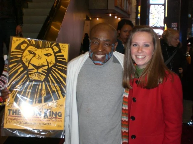 Teenage Emily posing with a cast member from The Lion King on Broadway.